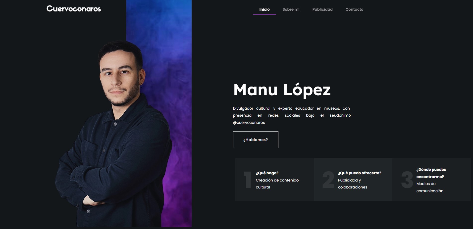 Cuervoconaros – Página Web Cuervoconaros – Página Web y SEO Manu Lopez, también conocido como Cuervoconaros, nos contactó para pedirnos una página web que le ayudase a contar en Empezar a leer » abril 15, 2025